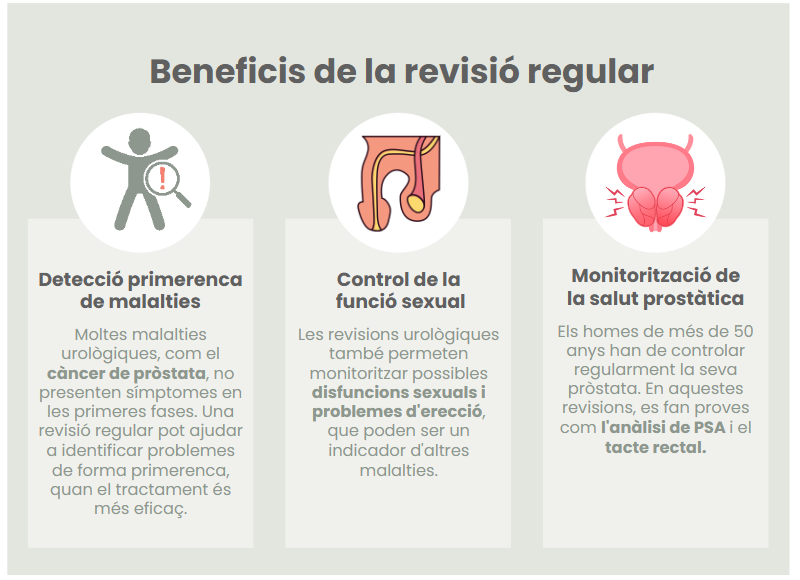 Detecció primerenca de malalties: moltes malalties urològiques, com el càncer de pròstata, no presenten símptomes en les primeres fases. Una revisió regular pot ajudar a identificar problemes de forma primerenca, quan el tractament és més eficaç.
